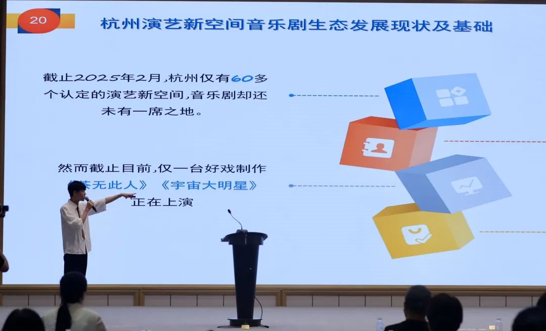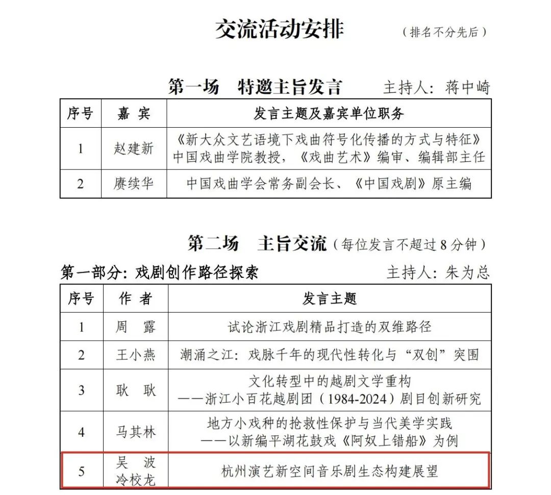 值得关注的是,我系音乐剧教研室表导演教师吴波与22级音乐剧冷校龙撰写的论文《杭州演艺新空间音乐剧生态构建展望》入选本次戏剧交流活动,并受邀在主旨交流环节进行学术发言。该论文聚焦杭州演艺新空间音乐剧生态构建这一前沿课题展开系统研究,深入剖析了在文化产业高质量发展与文化软实力提升的双重驱动下,如何依托杭州深厚的历史文化底蕴与蓬勃的创新动能,构建 “文旅融合、文商联动、文教共进、科艺共生” 的四位一体音乐剧生态系统。此项研究不仅为杭州音乐剧产业的可持续发展明晰了路径,更在推动城市文化品位提升与文化产业高质量发展方面提供了具有前瞻性的理论参考。