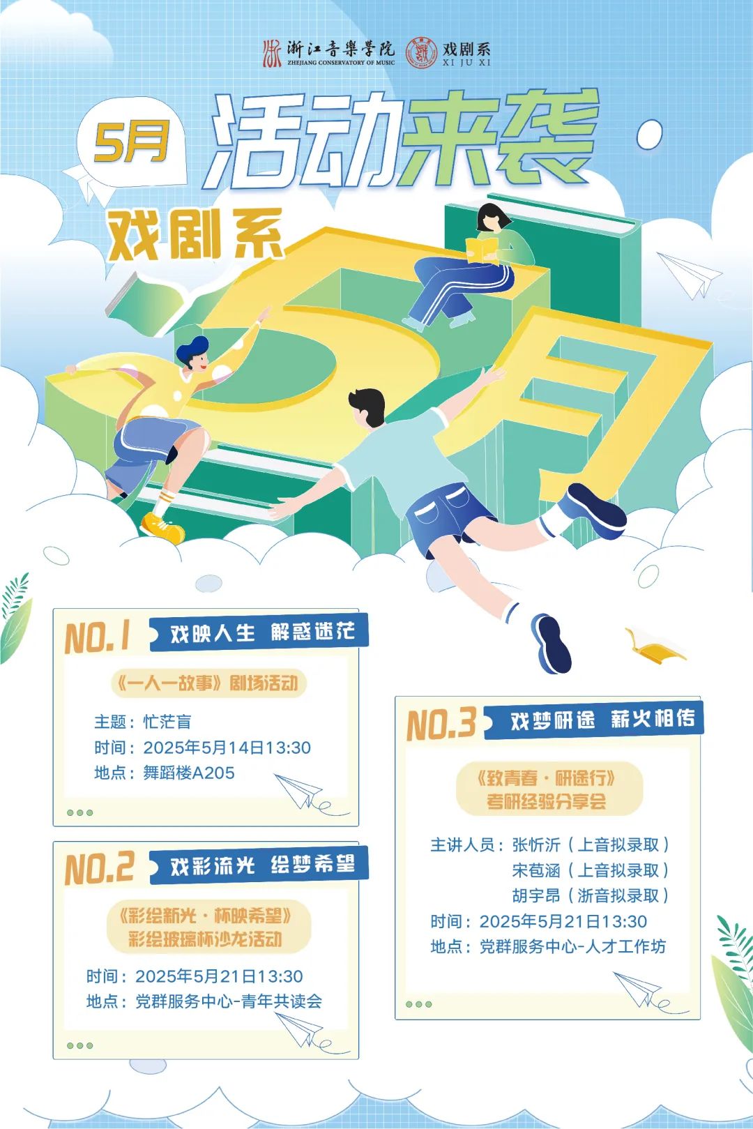五月阳光正好,戏剧系倾心筹备一场场创意与惊喜交织的盛宴!在这里,你能在剧场中解人生困惑,用彩绘勾勒梦想轮廓,还能汲取考研上岸秘籍。这个五月,与戏剧共赴一场绮丽之约!在艺术浪潮中绘就你的“出彩”青春画卷,绽放独属戏剧人的熠熠华光!还等什么?快来看看吧!