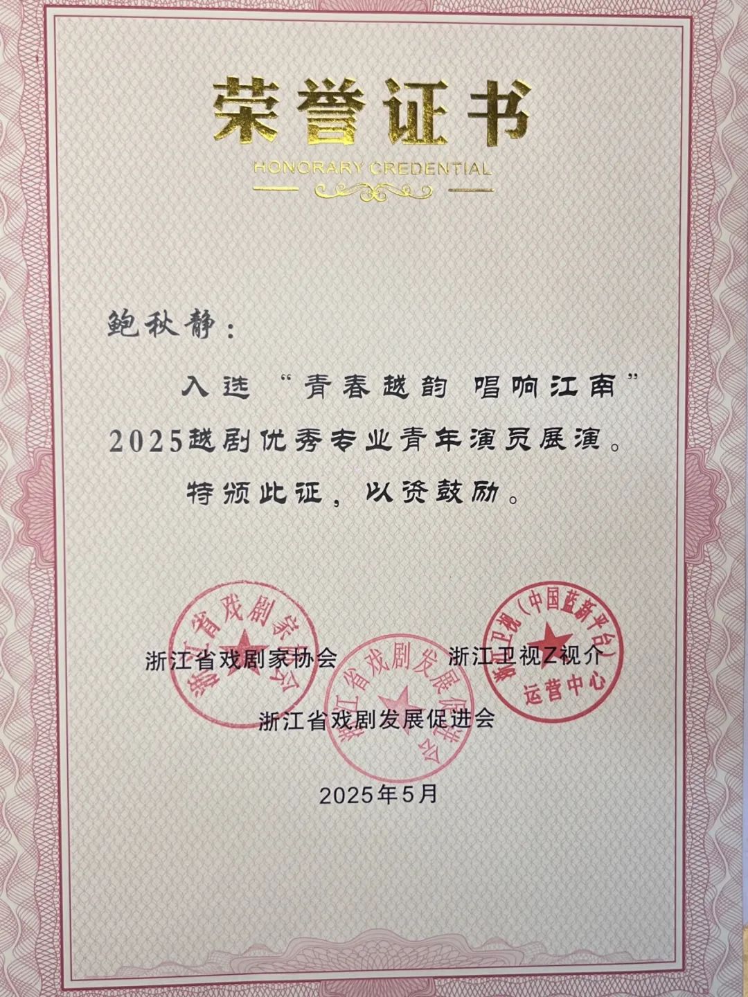曾入围参演第五届“梨花杯”全国青少年戏曲教育教学成果展示活动,并成功入选浙江音乐学院叔同学院2024年“拔尖人才培养计划"。