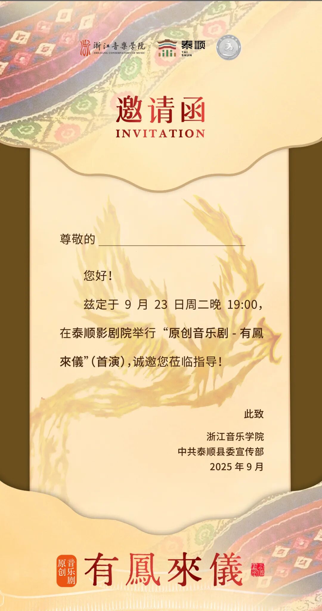 浙江省首批文化特派员校地共建文化成果原创音乐剧《有鳳來儀》将于9月23日(周二)19:00在浙江泰顺影剧院首演。