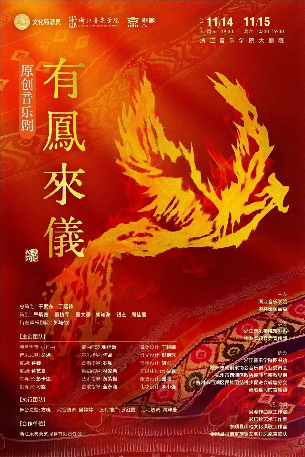 <!DOCTYPE html> <html> <head> </head> <body> <p> </p> <p> </p> <p><img style="display: block; margin-left: auto; margin-right: auto;" src="/attachment/20251104/6d770f2f6f3c973f8f1f1ce98e0d5556/600.jpeg" data-imgfileid="100020957" data-ratio="1.4990741" data-s="300,640" data-type="jpeg" data-w="1080" data-src="/attachment/20251104/6d770f2f6f3c973f8f1f1ce98e0d5556.jpeg" /></p> <p> </p> <p> </p> <p> </p> <p> </p> <p style="line-height: 1.5; text-indent: 2em;"><span style="font-family: FangSong, serif; font-size: 18px;">原创音乐剧【有凤来仪】从畲乡的晨雾里采集灵感,让山哈的歌谣在旋律中流淌。【有凤来仪】不止是舞台上的光影,更是畲族文化的鲜活诉说。有凤来仪的故事一直在传扬。11月14日(周五)19:30;11月15日(周六)14:00和19:30,我们相约浙音大剧院,不见不散!</span></p> <p> </p> <p> </p> <p><strong>END</strong></p> <p> </p> <p> </p> <p>编辑:王浩宇</p> <p>责编:徐心宇 朱伊娴</p> <p>初审:吴婷婷</p> <p>终审:董杭军</p> <p><img style="display: block; margin-left: auto; margin-right: auto;" src="/attachment/20250916/e4ea5d5db317f34fab6cbbbecb214a2e/600.jpeg" data-ratio="0.412963" data-s="300,640" data-type="jpeg" data-w="1080" data-imgfileid="100020955" data-src="/attachment/20250916/e4ea5d5db317f34fab6cbbbecb214a2e.jpeg" /></p> <p> </p> <p> </p> </body> </html>